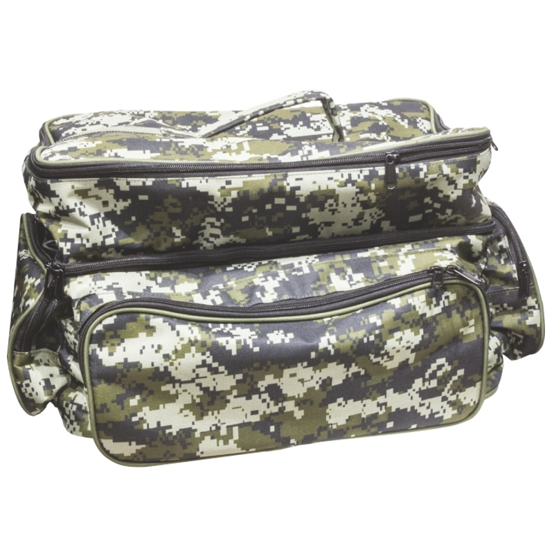 Velká rybářská taška se třemi kapsami. Kvalitní zipy, pevné švy a kvalitní materiál zaručují dlouhou životnost. Díky maskáčovému vzoru na ní nejsou vidět skvrny od hlíny nebo od trávy. Vhodná na rybářskou bižuterii, krmení i jídlo.